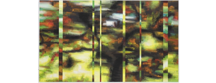 Là-bas...Toi est une double exposition qui investit de manière inédite les deux galeries Nathalie Obadia de la rue du Bourg-Tibourg et de la rue du Cloître Saint-Merri. Rue du Bourg-Tibourg, se déploie Là bas…, dans le cadre de laquelle Carole Benzaken présente des tableaux d’une même série intitulée Greffe, dont le mouvement latéral de coups de pinceaux analogue au mouvement d'une caméra, se déploie dans l’espace de la galerie. D’un tableau à l’autre, la couleur passe du vert au rouge, comme une variation de lumière nous éblouissant jusqu’à saturation chromatique. Le bougé et la scansion de bandes coupées, superposées, décalées, apportent à chaque peinture une notion de vitesse. « Ce qui importe ici c’est un retour au tableau comme pièce unique mais compris dans un flot le dépassant... saisissant l’espace, s’en emparant en invitant le visiteur à se déplacer vers un “là-bas” », explique l’artiste. Visuel : Greffe 4, Carole Benzaken, 2018.