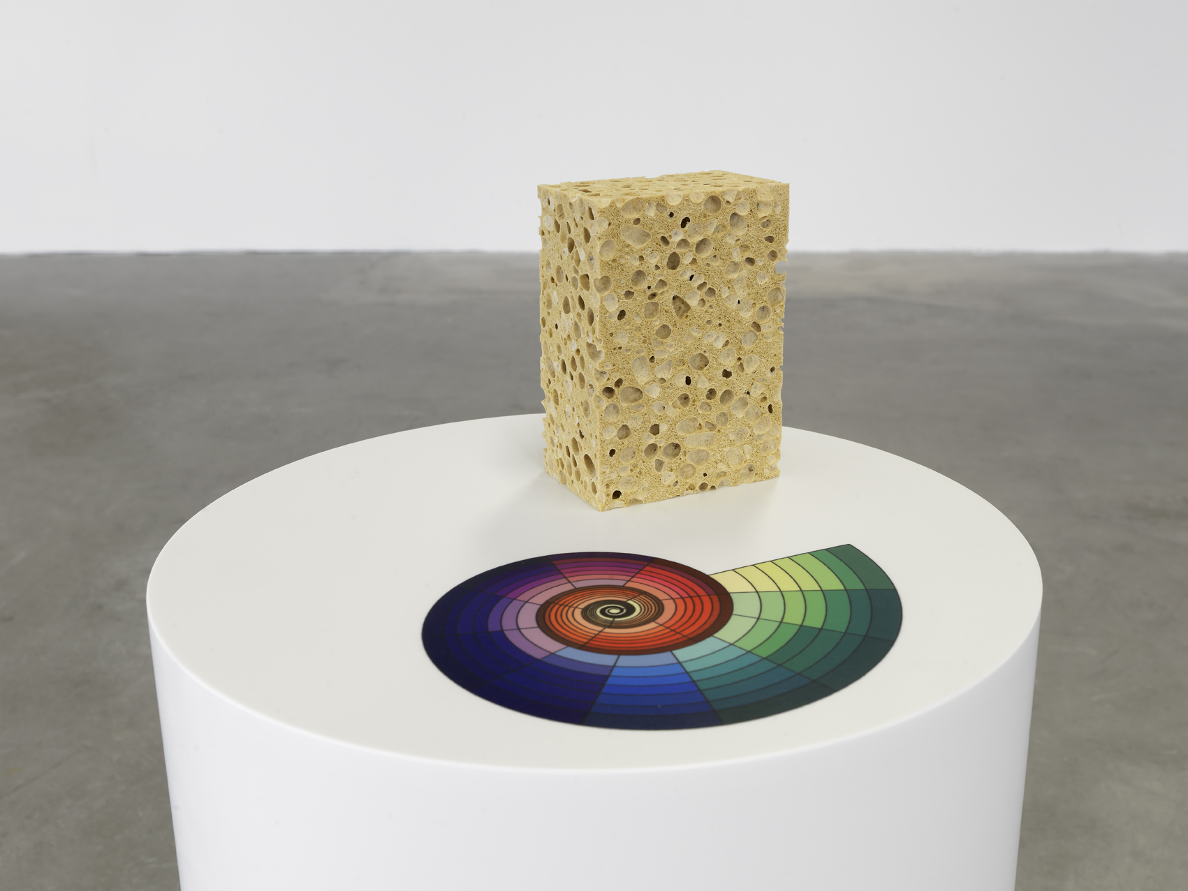 Dans la deuxième salle de l’exposition, trois pièces figurent une scène de rue : un vélo appuyé sur un poteau blanc, en Corian lui aussi, rehaussé de trois pastilles de couleurs (bleu, rouge et jaune) traversées d’un trait noir comme inscrit à la bombe, deux morceaux de canalisation disposés de manière à former une sorte de banc et un lampadaire dont les « bras », aux dimensions d’un panier de basket, accueillent de belles boules lumineuses. « Jouant de la transformation des standards, ce décor reformule notre relation à l’extérieur et notre manière d’appréhender les formes qui nous entourent », précise Claire Le Restif. Chaque œuvre dépasse le stade de la représentation pour déployer une sphère de références culturelles plus vaste. « Les pièces ne valent que par leur capacité (…) à s’insérer dans un champ social et politique », poursuit-elle.Comme un bol tibétain