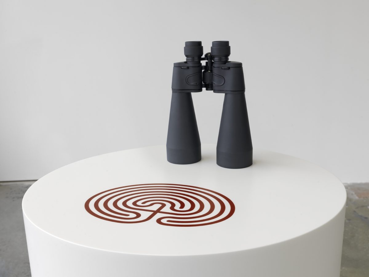 Au bout de la rue, à quelque cinq minutes à pied du métro Mairie d’Ivry, apparaît le bâtiment de briques rouges de la Manufacture des œillets. Là, au troisième étage, dans un bel espace nimbé de lumière, débute l’exposition consacrée par le Crédac aux œuvres récentes de Mathieu Mercier. Dix pièces silencieuses et sages demandent une attention particulière. Pour chacune d’entre elles, un objet (paire de jumelles, cruche, pile d’assiettes creuses, mallette ou vase) est posé sur un socle cylindrique blanc en Corian (sorte de résine), au-dessus duquel a été imprimé, par un procédé dit de « sublimation », un pictogramme, une illustration ou la représentation d’un outil de mesure. Ces rébus, associations improbables d’idées, obligent concret et symbolique à dialoguer jusqu’à la fusion pour former un tout autre, une œuvre qui dépasse la somme de ses éléments.