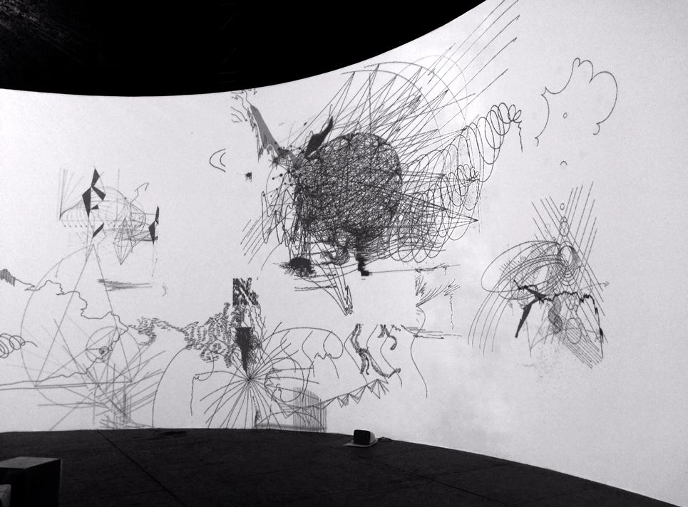 Présentée simultanément à l’Hyperpavilion de la Biennale de Venise, Climat Général est une œuvre auto-générative, un hyperdrawing qui associe la notion d’Anthropocène aux enjeux du dessin. Artiste engagée, Claire Malrieux crée un espace graphique où le dessin devient un écosystème composé des forces atmosphériques, telluriques et humaines. Se référant à l’ « Hypothèse Gaïa » de James Lovelock ( Selon lui, la Terre serait « un système physiologique dynamique qui inclut la biosphère et maintient notre planète depuis plus de trois milliards d’années en harmonie avec la vie ».), Claire Malrieux transforme la figure de Gaïa en une machine climatique autonome qui affiche un espace dynamique et organique, construit selon des flux de données empruntés aux principaux modèles climatiques prédictifs. À travers différents scénarios programmatiques, l’artiste met en évidence l’influence de l’homme sur son environnement, un environnement en perpétuelle mutation dont la fin ne peut être programmée. Car si l’entrée dans l’Anthropocène marque la fin d’une Terre en extension, elle marque surtout le début d’autre chose : une situation différente dans le temps et dans l’espace. Un espace où le décor est en mouvance et dans lequel l’histoire humaine s’adapte et évolue. L’usage simultané du dessin et des algorithmes permet de visualiser des interactions et des causes à effets habituellement invisibles, de les décoder et d’en interroger les enjeux. En prenant le dessin comme un langage capable de saisir sans la figer la structure du contemporain, Malrieux entend nous faire explorer les nouvelles zones de contact d’une culture désormais convertie au numérique. Visuel : Climat Général, 2017.