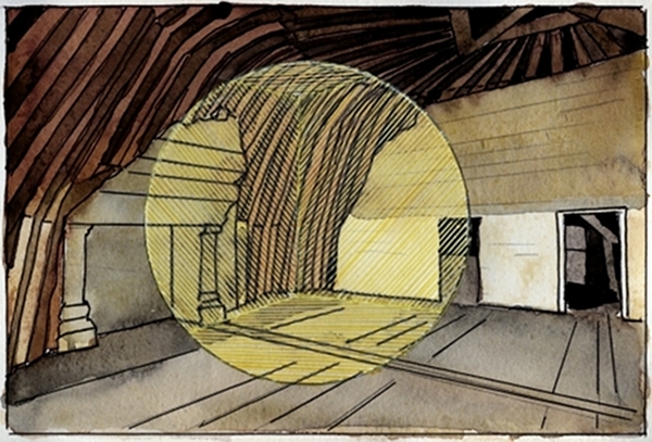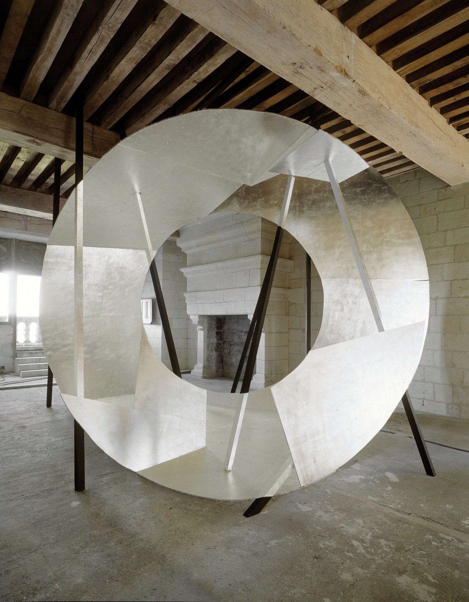 C’est dans les combles de la tour Dieudonné qu’il choisit de mener la phase initiale du projet : sous la charpente à enrayure du XVIe siècle, s’élève une haute structure en bois ajourée, constituée d’un réseau de lattes – disposées à la verticale et à l’horizontale – laissant voir l’architecture de l’endroit. En ce qui concerne la couleur, deux versions se sont succédées : la première, blanche, intégrant « visuellement » davantage les poutres et la charpente ; la seconde, jaune, venant « prendre le pas » sur le lieu et évoquer la lumière du soleil qui s’insinue dans la salle. « Pour moi, ce sont deux œuvres différentes : deux lectures d’un même espace. » Dans un coin de la pièce, deux morceaux de ruban adhésif forment une croix sur le sol. C’est à cet emplacement précis que l’artiste est venu poser – à une hauteur tout aussi précise – la chambre photographique grand format qu’il utilise pour restituer en deux dimensions ses transformations d’espace. Un résultat fascinant qui voit la structure en 3D devenir sur l’image une forme ronde parfaite.