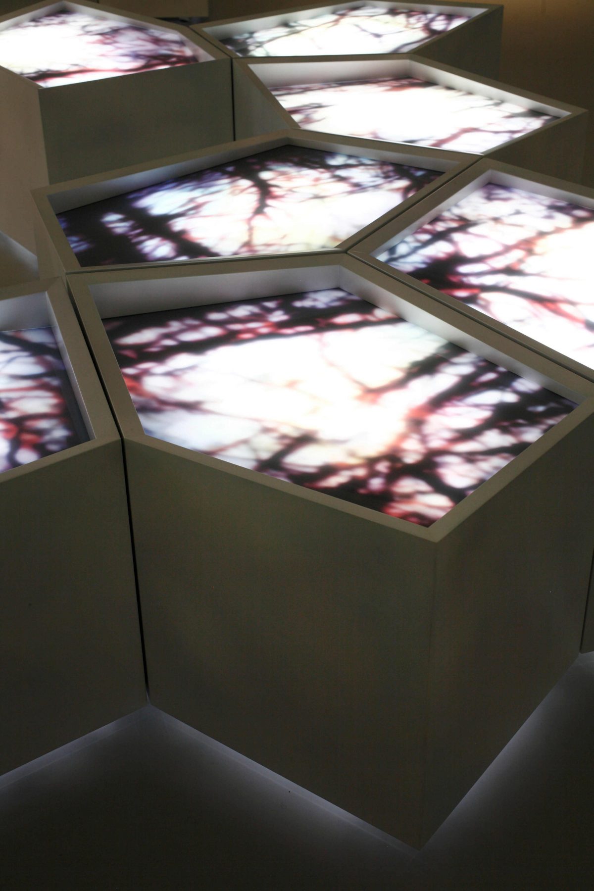 Ecclésiaste 7 : 24, paysages fugaces dans de grands caissons lumineux, invite à un autre type d’échappée. Les images superposées plutôt qu’accolées en mode linéaire créent une sorte de mouvement interne. Le tableau devient alors l’endroit même du déplacement. L’œuvre est actuellement présentée au Musée d’art et d’histoire du Judaïsme de Paris dans le cadre de l’exposition Saviv saviv, fruit d’un long travail de recherche associé à un retour sur une histoire familiale et collective douloureuse et qu’elle définit comme « un projet de vie au-delà de l’apparente fausse victoire de la mort, comme une vallée de larmes qu’il me fallait arpenter pour rendre visible cette espérance qui fait encore aujourd’hui défaut dans le spectacle du monde. »