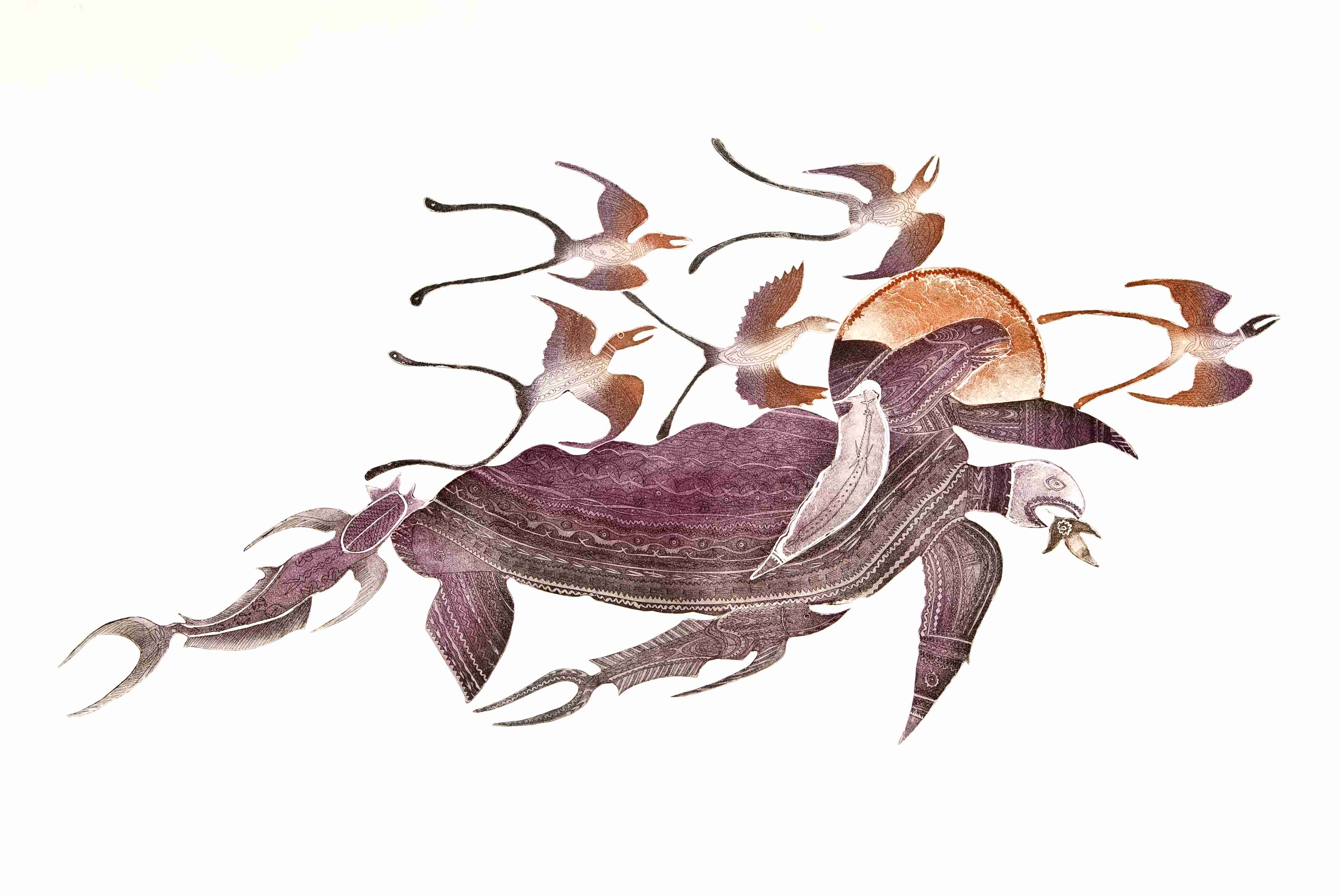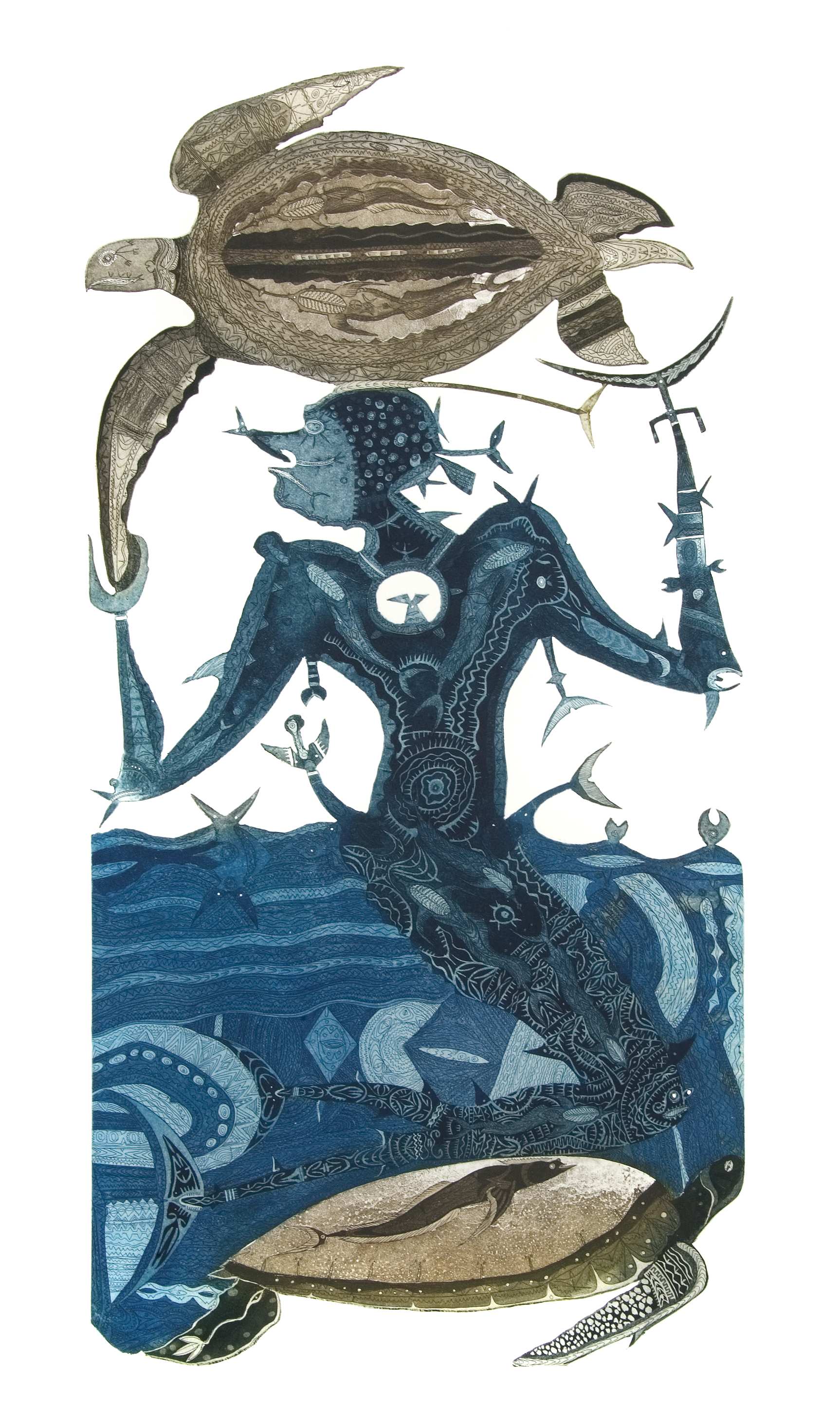 Au fil des ans, Dennis Nona développe une habileté technique hors du commun, qu’il déploie dans ses estampes et ses sculptures. Chacune, fourmillant de détails finement gravés et ciselés, témoigne d’un travail de longue haleine qui, souvent, s’apparente à un ouvrage de dentelle ou d’orfèvrerie. Reflétant celles de la terre et de la mer, les couleurs sont rarement vives ; l’artiste s’est d’ailleurs longtemps exprimé en noir et blanc, comme pour mieux préserver le lien entre le fond et la forme, entre son œuvre et l’histoire originelle qu’elle délivre. Car ses mains sont les interprètes d’un imaginaire foisonnant qui prend source au cœur de ses origines, s’appuyant sur l’histoire de son peuple transmise de génération en génération depuis des millénaires. Une transmission des traditions, connaissances, rites et lois longtemps exclusivement orale et qui s’est traduite à travers le chant et la danse. Par la magie de son trait et du bout de sa pointe sèche, Dennis Nona la révèle au monde.