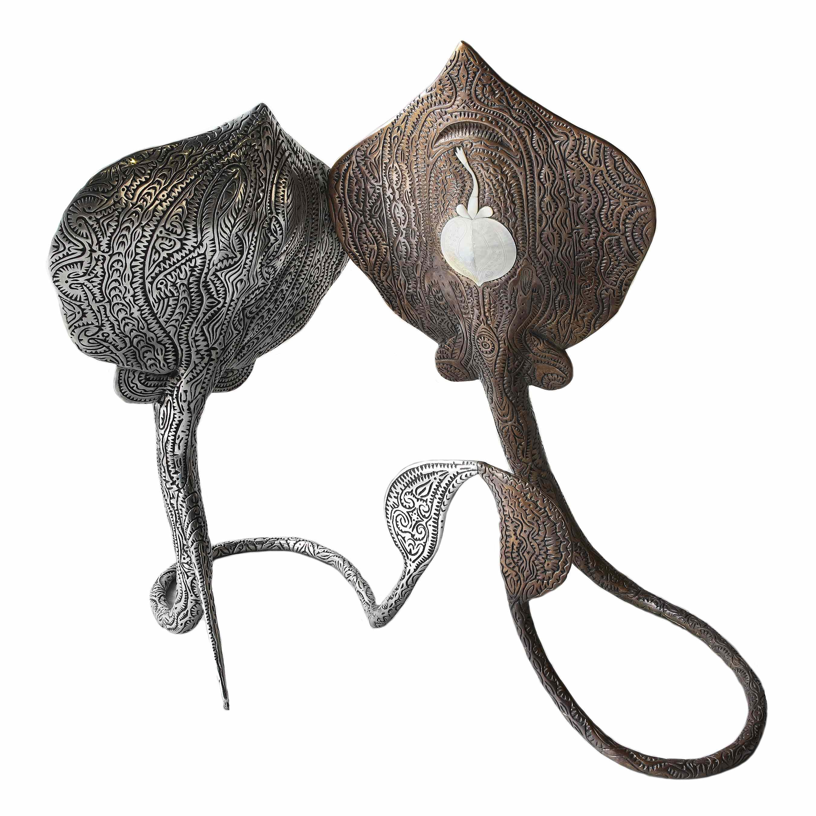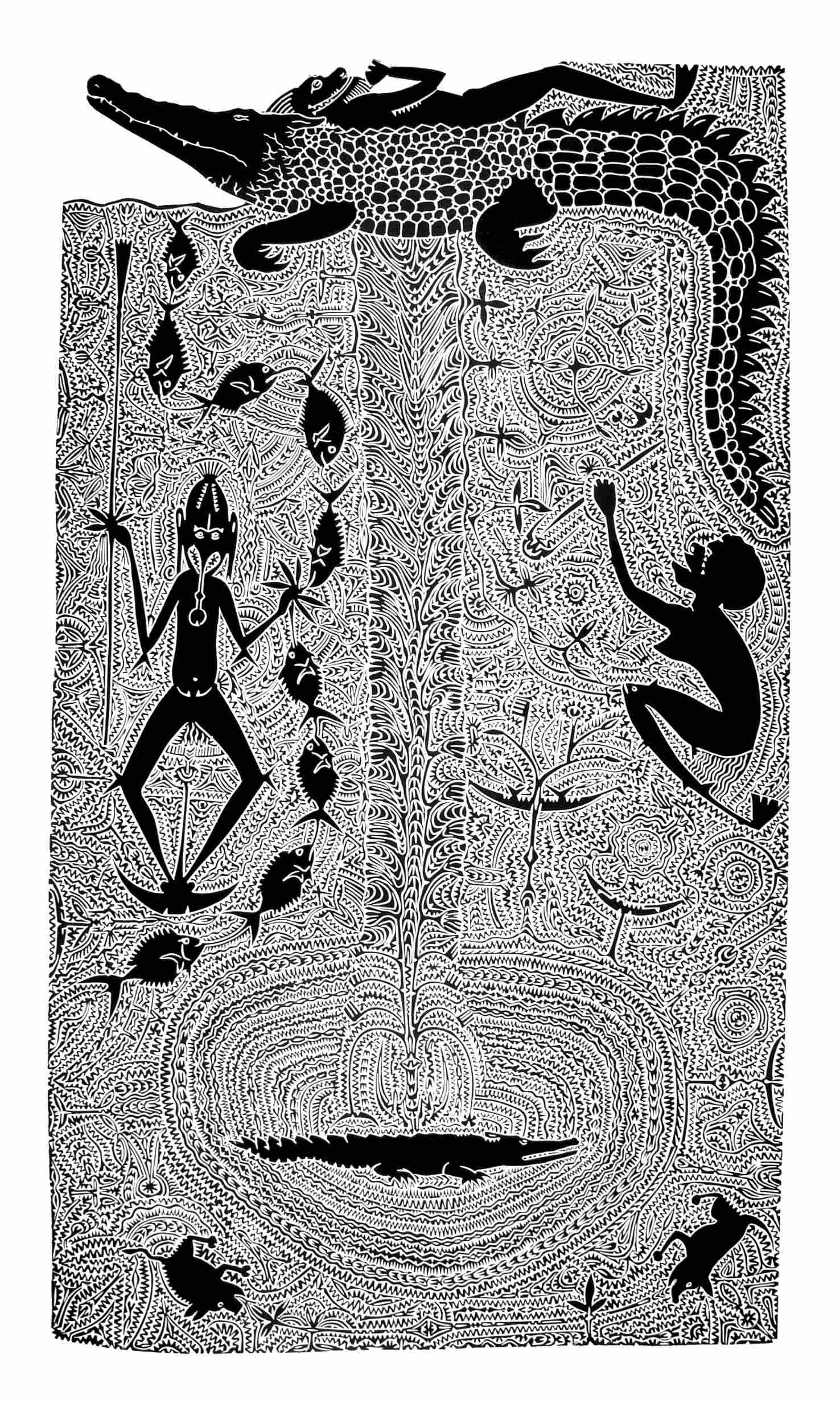 En attendant d’engager ce nouveau défi, il en relève incessamment d’autres, d’ordre esthétique et technique, liés aussi bien à la subtile complexité du dessin creusé dans le lino ou ciselé dans le métal qu’au format de ses œuvres. Yawar, par exemple, qui retrace l’aventure du personnage éponyme, est une estampe réalisée à partir d’une seule pièce de lino de six mètres de long. Lorsqu’elles ne sont pas découpées à l’aide d’une scie de bijoutier, nombre des plaques servant de support à ses eaux-fortes exigent un travail du métal si précis et affûté qu’il faut définir les contours au laser. Une technicité dont Dennis Nona ne se lasse pas de repousser les limites, offrant régulièrement de nouveaux défis aux fondeurs et graveurs qui l’accompagnent dans la réalisation de ses œuvres. « Nos ancêtres n’avaient peur de rien, c’étaient des chasseurs de tête », rappelle-t-il avec un sourire.