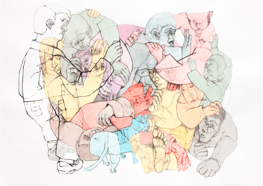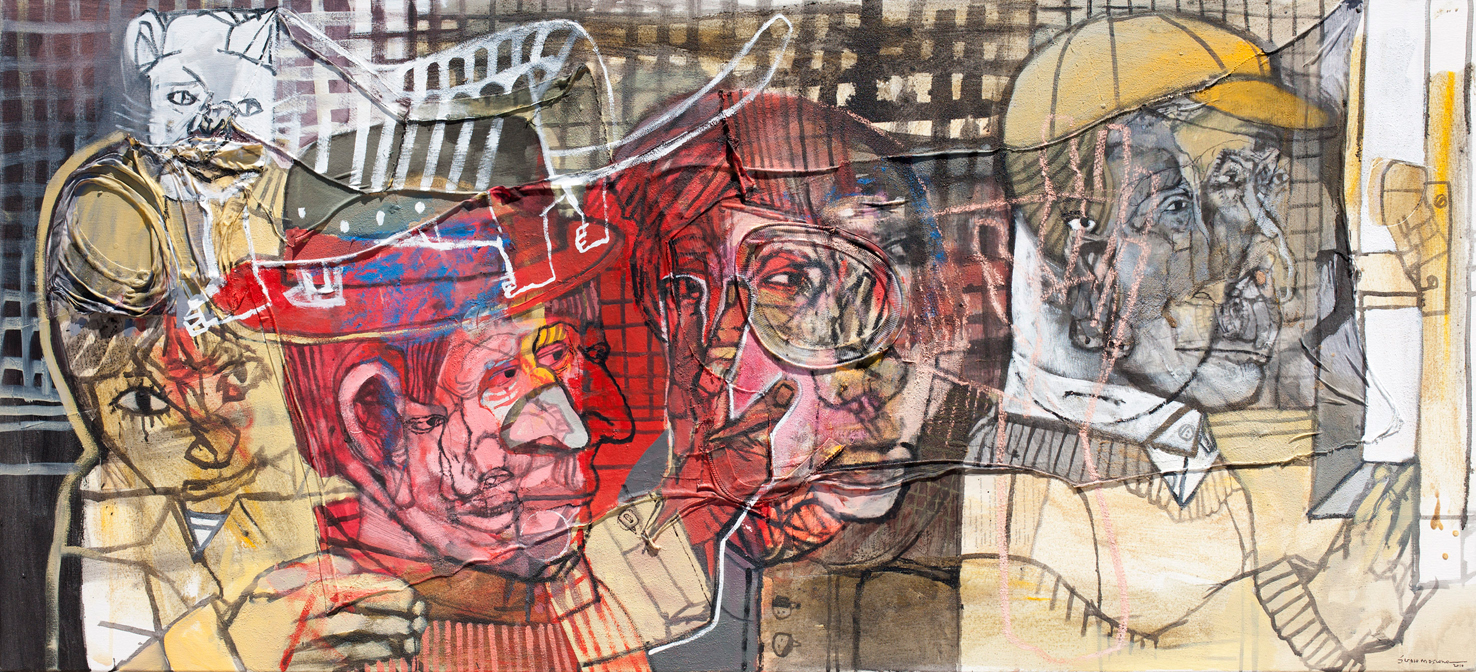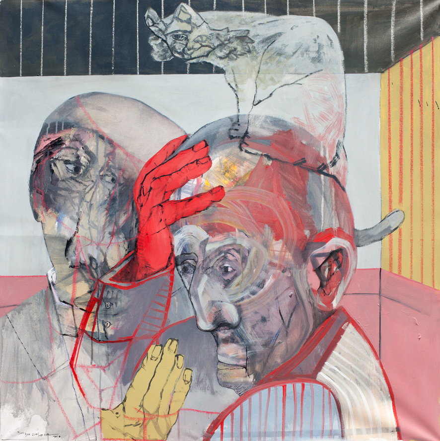 Avec ce sens du tragique qui a si souvent illuminé l’âme hispanique, et notamment celle du Siècle d’or – du roman picaresque avec le Lazarillo de Tormes ou de La vie est un songe de Calderón de la Barca –, Sergio Moscona surgit dans le monde de l’art d’aujourd’hui en flamboyant météore qui n’a pas fini de jeter ses lueurs, fussent-elles parfois crépusculaires, ironiques ou sardoniques. La trentaine, le jeune peintre argentin pourrait, à l’image de Sigismond, le héros du dramaturge, déclarer : « La vie, c’est ce songe que je fais à présent. » L’homme, on ne peut en douter, le fascine ; cet infiniment petit plongé au sein de l’infinitude, Moscona n’en finit pas, au prix d’une insolente authenticité, sans complaisance, se refusant au jeu de la séduction, de frayer un chemin dans la multitude et le fracas, le dépouillement et les mutilations – corps et âmes –, d’aborder des êtres imbriqués qui s’étreignent, se disputent un espace où ils semblent inexorablement confinés ; des hommes saisis dans leur désolante incomplétude, aux visages graves, comme griffés, sillonnés de traits, de sillons de vies superposées, strates d’un passé révolu dont on ne peut guère espérer la moindre grâce. Dans une série d’encres acryliques sur papier intitulée Les architectes de la parole, une singulière élévation de corps enlacés, la Babel hautement symbolique ne dit rien qui vaille, sinon l’aventure dérisoire d’une humanité en quête de la parole perdue, d’un amour irrémédiablement éperdu ; Babel aurait-elle fini de hanter les hommes ? Selon l’astrophysicien Stephen Hawking : « Il n’est pas nécessaire d’invoquer Dieu… L’Univers peut, et s’est créé lui-même à partir de rien. La création spontanée est la raison pour laquelle il y a quelque chose plutôt que rien, la raison pour laquelle l’Univers existe et nous existons. »