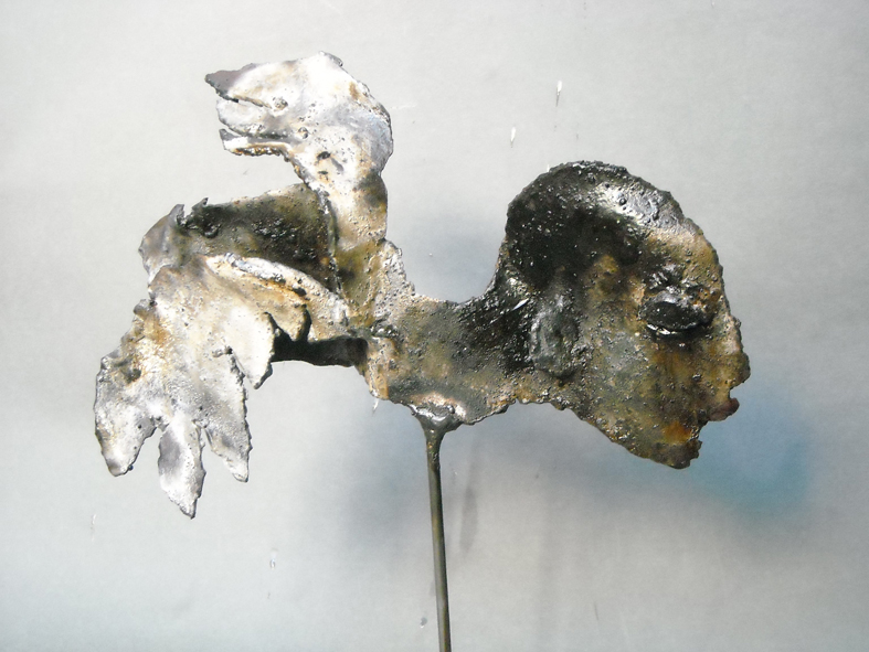 Autre univers, autre insolente réalité que celle du sculpteur Haude Bernabé qui nous invite au noble art de la forge. C’est un parfait contre-chant aux œuvres de l’artiste argentin. Le métal soudé, patiné, vibre et s’enchante ; la lave incandescente s’est depuis longtemps figée avant de se réanimer sous la flamme du chalumeau. Cet art des origines de l’humanité trouve avec cette artiste autodidacte ses lettres de noblesse ; fantaisie, émotion, drôlerie, mémoire et interrogation se sont donné rendez-vous. Médiateur depuis toujours, le forgeron n’a cessé de braver les mystères de la création. Il est un des huit génies de la cosmogonie des Dogons du Mali ; Haude Bernabé confie avoir un « ange gardien africain ». Soul sister ou A fleur de peau ou encore Vaudou semblent affirmer de lointaines affinités électives sinon de très anciennes racines avec ce continent de nos origines. L’utilisation de pigments colorés trouble la fête du pur métal, entre rouille et patine, mais c’est pour mieux faire chanter le fer inanimé qui parfois prend son envol avec Sauve qui peut plus léger que l’air, mais un brin tourmenté, comme ce troublant Entre les lignes. Si la magie de la flamme n’est plus qu’un lointain souvenir, la trace demeure, et surtout, la rêverie poétique de l’artiste qui nous livre de Petites et grandes histoires et celle d’un fer incontestablement rougi à blanc avant de nous révéler les arcanes de son chant venu du fond ses âges.