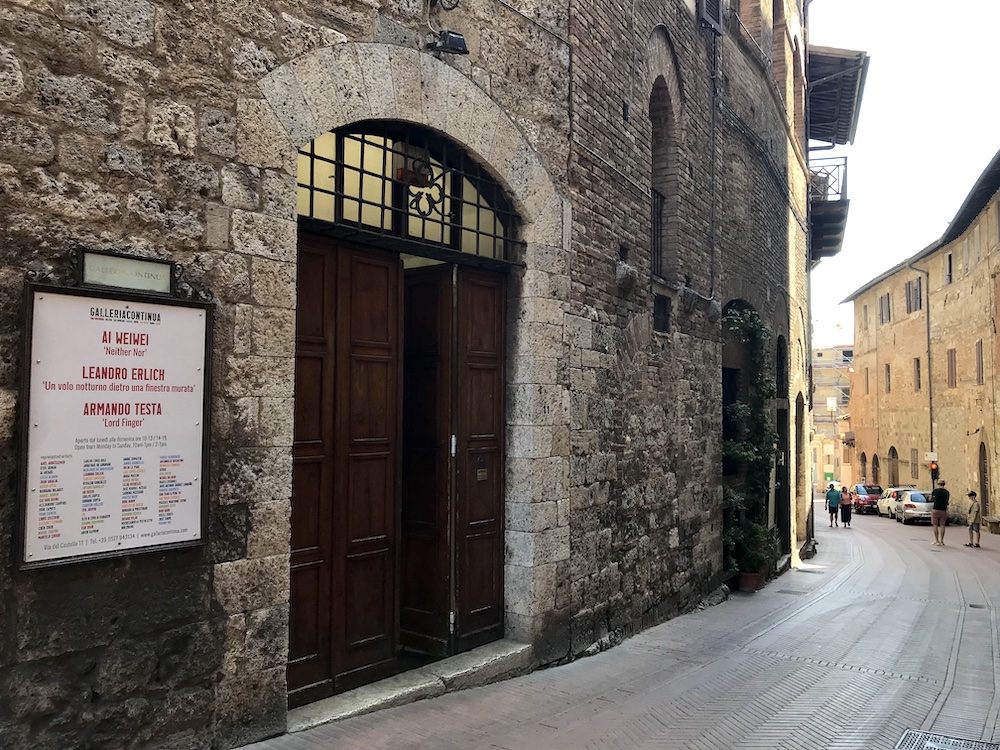 C’était en projet depuis longtemps, passer à San Gimignano pour découvrir le biotope de la Galleria Continua. Fondée en 1990 par trois amis (Mario Cristiani, Lorenzo Fiaschi et Maurizio Rigillo), cette galerie est devenue une des institutions d’art contemporain parmi les plus reconnues au monde grâce à une volonté farouche de faire (re)vivre des lieux atypiques, en pleine campagne ou au cœur des villes, et surtout d’offrir un espace de libre création à ses invités. Le choix d’opérer dans des sites non conventionnels a appelé des propositions artistiques hors normes nouant des conversations uniques avec les diverses architectures ou paysages investis. Au cœur de chaque invitation, se développe l’idée d’une collaboration, de la réalisation d’un projet commun. C’est ainsi que la légende s’est construite. A partir de ce petit joyau médiéval de Toscane, cet esprit anticonformiste a essaimé. Aujourd’hui, il dispose de relais à Pékin, Les Moulins, La Havane, São Paulo, Rome, Paris et Dubaï. Comme le suggère son nom, la Galleria Continua s’applique à inscrire les artistes qu’elle reçoit dans la continuité de l’histoire de l’art et par là même de la poursuivre. Depuis plus de 30 ans, l’ancien cinéma de San Gimignano a vu défiler les plus grands noms de l’art d’aujourd’hui et ceux en passe de le devenir. Peu importe qui expose, vous y verrez le meilleur de son œuvre.