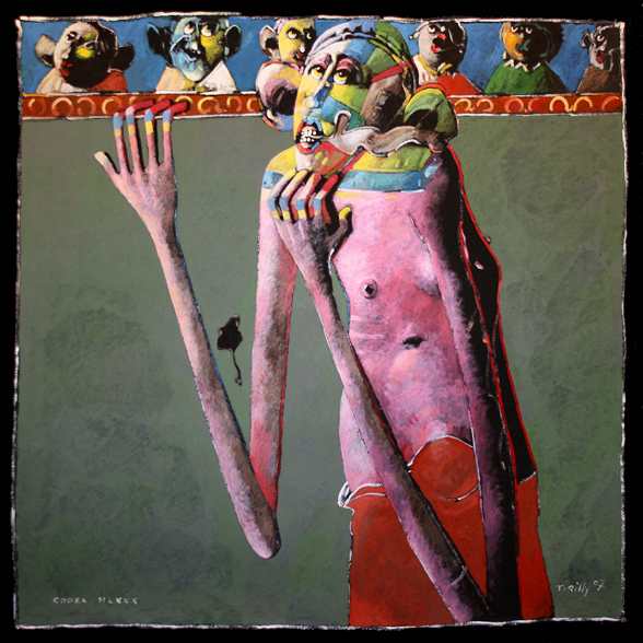 Il y a ceux qui osent et ceux qui renoncent. Jean Tirilly attendra presque quarante ans avant de se « lancer en peinture ». Il s’engage dans l’armée à 16 ans, fait trois fois le tour du monde. Chemins de traverse et boulots alimentaires, l’artiste côtoie les milieux de la publicité, de la psychiatrie ; il étudie le zen. Tandis qu’il nourrit son imaginaire, germe en lui au fil de ces années le désir de briser l’anonymat. Il rentre en Bretagne, à Léchiagat, brûlé par la peinture. Sa mère est sceptique mais elle accepte de l’aider. Autodidacte et reclus volontaire, Jean Tirilly met au point son alphabet graphique, invente son style. En 1984, il vend sa première toile. L’enthousiasme des collectionneurs fait le reste. Très vite, la notoriété de l’artiste dépasse les frontières de la Bretagne ; ses toiles s’exposent à la Collection d’art brut à Lausanne et au musée d’Art spontané à Bruxelles. A prendre le risque de dévoiler son âme, Jean Tirilly a bouleversé les cœurs.