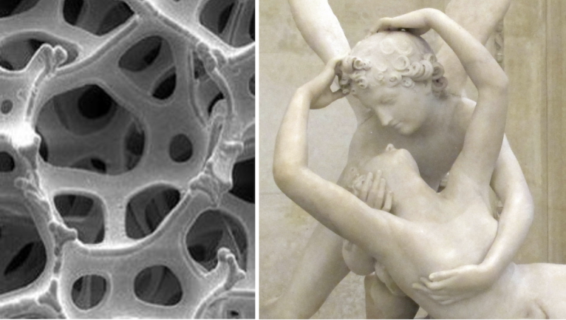 Si le sujet abordé par cette chronique est une « tarte à la crème » dans le domaine technique, sa crème est bien différente dans le domaine de l’art. Même si « fabrication additive » recouvre de nombreux procédés, notons que cette dénomination générique sera employée pour simplifier la rédaction de notre article. De même, ce dernier se dispensera de l’usage des majuscules à Fabrication Additive, pourtant recommandé par les spécialistes. Les procédés s’y rapportant y seront éventuellement précisés. Hors domaine de l’art, l’engouement pour la fabrication additive est comparable à celui qu’avaient suscité, en leur temps, le laser, les nanotechnologies/nanomatériaux, et autres supraconducteurs. La fabrication additive est, en effet, considérée comme une panacée parmi les procédés de fabrication/transformation de matériaux, ses applications pullulant en tous secteurs. Sachant cela, il était logique de mettre en exergue de la chronique, Psyché ranimée par le baiser de l’Amour par Canova : pour le symbole, d’une part, car la fabrication additive réveille bien les procédés de fabrication, tout comme le baiser d’Eros ranime la belle endormie, quitte à choquer les contempteurs actuels de pareils comportements, au grand dam des défenseurs des Frères Grimm et autre Disney ; pour ses capacités de fabrication, d’autre part, car la réalisation des formes complexes et leur intrication lui sont facilement accessibles. Si Canova a dû recourir à tout son génie pour sculpter pareille beauté, les techniques de fabrication additive d’aujourd’hui sont dites pouvoir rivaliser facilement avec lui quant au travail de la matière, en beaucoup moins de temps qui plus est. Ces dernières, en effet, peuvent aussi bien produire des objets aux formes convexes que concaves, quelles qu’en soient leurs dimensions et leur nature. Une mousse de nickel (pour l’industrie automobile), aux cellules millimétriques (figure 1a), peut ainsi, par exemple, être obtenue assez rapidement (quelques minutes) par fabrication additive par laser. Vu la souplesse du procédé, elle pourrait être, tout aussi bien reproduite homothétiquement en d’autres dimensions. Cet exemple vise à montrer la parenté de forme avec l’Eros et Psyché de Canova déjà citée (figure 1b). Pour s’en rendre bien compte, le lecteur est invité à regarder la figure 1 en louchant pour en superposer les deux parties. Le recours à une application de superposition d’images, moins pauvre et plus évoluée, surtout si elle est affublée du nom de compositing, peut achever de le convaincre, sans ruiner plus ses yeux. La fabrication additive peut ainsi être envisagée comme susceptible de se substituer, en tout ou partie, aux techniques de modelage, de taille, de moulage et d’assemblage, qui constituent les procédés fondamentaux de la sculpture, chacun étant mobilisé selon le type de matériau et la nature des œuvres visées, notamment leurs dimensions.