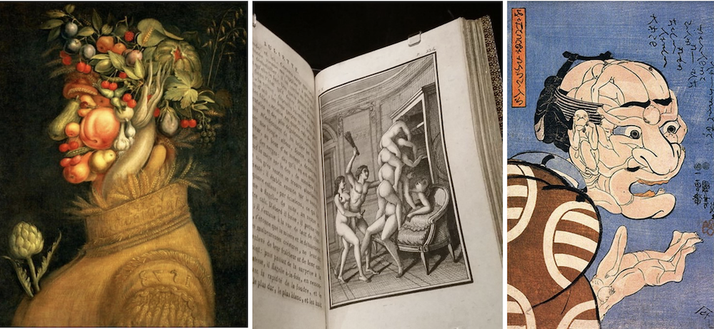 L’artiste canadienne, Meghan Price, avec une technique comparable de bas-relief, dans son New Balance 3 (2017) (figure 9), conjugue les messages portés par Erró et Arman. Elle y montre, par l’utilisation pour ses œuvres de déchets post-consommation, ici de vieilles chaussures de course, la contamination de la planète. Dans New Balance 3, la superposition des couches de textiles et de mousses synthétiques symbolise la couche supérieure de la croûte terrestre, exemple tout aussi supérieur d’accumulation s’il en est. Ces quelques représentants de l’art moderne ou contemporain n’ont fait que suivre le goût pour l’accumulation déjà exprimé par d’emblématiques prédécesseurs : Arcimboldo (figure 10a), quelque graveur libertin pour Sade (figure 10b) et Kuniyoshi dans le même registre (figure 10c). Trémois en représente la quintessence (sans décence) dans son huile sur bois monumentale Drôle d’histoire (1991) qui n’est, cependant, pas montrée ici pour ne pas choquer le lecteur. Moins choquantes, les peintures, cubistes, naïves ou les remarquables caricatures de Wozniak, pourraient l’être mais elles ne seront que citées, faute de place (surtout en 2D), pour souligner que leur parti pris de privilégier le 2D et les à-plats peuvent conduire à amplifier l’effet d’accumulation : par exemple dans les paysages du Douanier Rousseau ou, notamment, dans le dessin de Wozniak dénonçant pourtant une accumulation (mais sous une autre forme), Les ultrariches aiment la grosse caisse (2025). Peu naïf, le métallographe, dans sa visualisation de la microstructure des matériaux, œuvre, cependant, dans le même sens que tous ces artistes. Il met, en effet, en évidence que la matière obtenue par fabrication additive n’est qu’accumulation de cristaux (grains) et phases diverses (figure 10d) dont les caractéristiques dépendent de la composition chimique. L’accumulation des grains n’en est que plus apparente qu’elle est observée par des techniques 3D comme la microtomographie X. Ces techniques de pointe habituent le regard à l’observation 3D en science des matériaux, ce qui leur confère une certaine noblesse. Il en est, de même, dans le domaine de l’art, où le regardeur un peu snob se plaît à voir et vouloir du 3D partout, jusqu’à en être chagrin quand il n’en a pas : à l’image du visiteur de musée auquel le dessinateur Voutch fait dire, non sans humour, devant une peinture classique : « Pas mal, pas mal. Mais, fondamentalement, tout ça, pour moi, ça reste de la 2D. ».