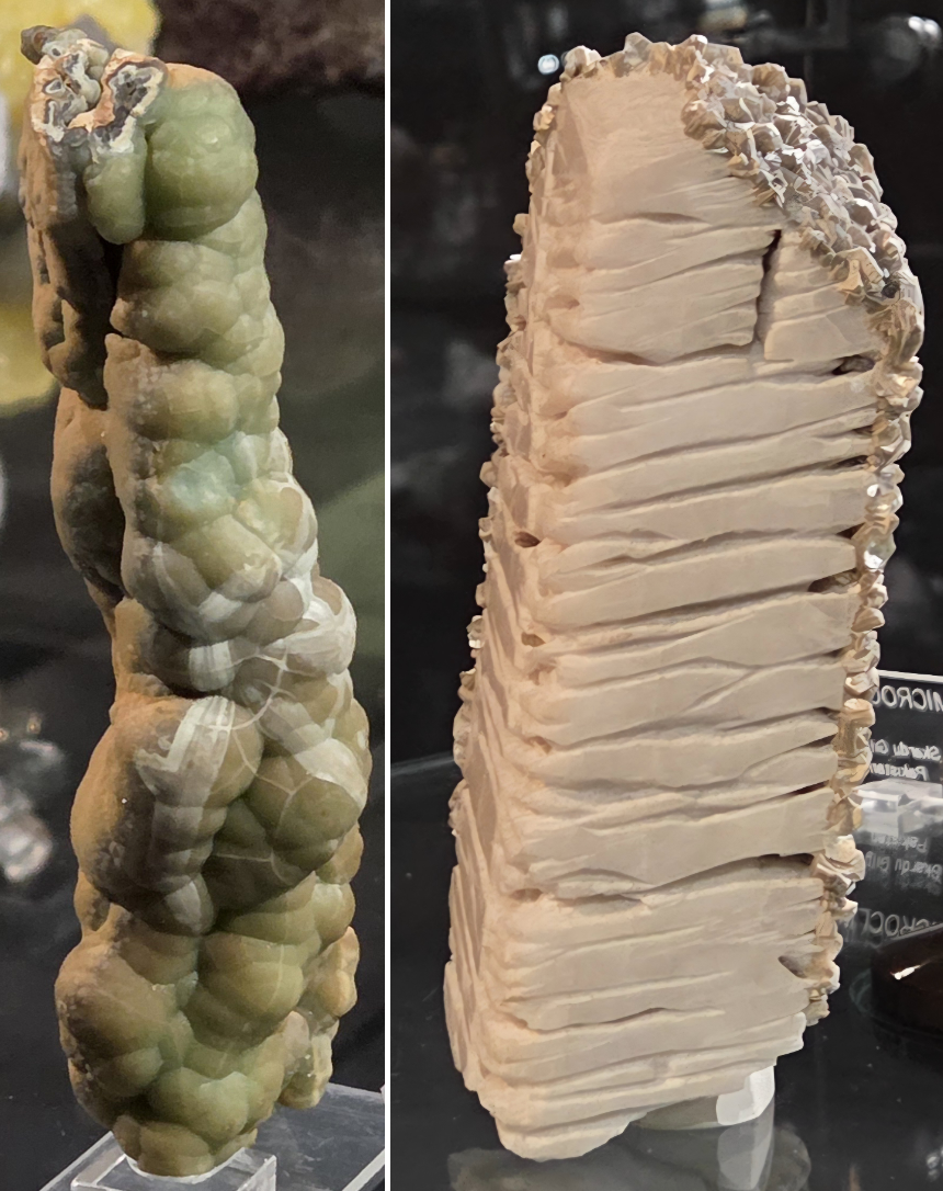 Elle est de deux sortes, d’une part, de ce qui a disparu à cause du temps, c’est-à-dire l’obsession du passé, et d’autre part, de ce qui a disparu à cause de l’espace, par masquage ou changement d’orientation du regard de l’observateur. Les considérations sensorielles liées à la question sont traitées dans des chroniques antérieures consacrées aux sens auxquelles le lecteur est invité à se reporter (Matériaux en tous sens, autorisés et interdits et Matériaux et synesthésie dans l’art). Les considérations obsessionnelles liées au temps voient probablement une première traduction chez certains amateurs/regardeurs par l’amour des pierres et minéraux. La pétrophilie, qui ne se soigne pas par lithothérapie, cela dit incidemment, n’est, en effet, que l’expression de l’amour de l’écoulement du temps figé sous forme minérale. Cette forme est celle de strates accumulées, géologiques en l’occurrence, incrémentant le temps passé comme peuvent le faire les cernes successifs marquant dans un bois les années écoulées. Il n’est donc pas fortuit de considérer les minéraux comme des représentations de la fabrication additive, #obsession du passé pour employer un jargon actuel (trop validé), d’autant plus qu’ils en recouvrent aussi la vocation artistique. La gippsite doyleite et le microcline de la figure 14 en sont des exemples parfaits par leur accumulations, l’une à la Botero (14a), l’autre à la Arman (14b). Ils illustrent ainsi que la minéralogie peut constituer un outil pédagogique dans l’enseignement artistique comme dans l’enseignement scientifique, puisque cette discipline se trouve à la charnière entre les deux. Cette prise de conscience est relativement récente, puisqu’elle ne se révéla que sous Napoléon III, avec la création à l’Université d’une chaire de minéralogie rattachée aux sciences physiques comprenant la chimie et la physique théorique. Roger Caillois, par son écriture des pierres et sa lecture (cf. ses deux ouvrages éponymes, notamment), en fut le plus grand chantre, des années plus tard. La fabrication additive, compte tenu de ses caractéristiques déjà décrites, se prête donc particulièrement bien à l’emploi d’un pareil outil pédagogique utilisant l’esthétique minéralogique pour relier l’art à la science. La minéralogie est même à considérer comme une première pierre (jeu de mots mis à part) dans la construction d’un outil pédagogique original commun aux arts et aux sciences. Cet outil dit « paréidolique » sera l’objet d’un développement particulier dans une chronique ultérieure. Il est fondé sur le principe de reconstitution à partir de ce qui peut être vu. Ce principe peut, cependant, être rapidement évoqué ici car il rencontre aussi l’obsession de ce qui a disparu, l’objet de cette partie de chronique faut-il le rappeler. Il appelle l’emploi de méthodes scientifiques, notamment, optiques et numériques. Le géographe, naturaliste, y a recours, par exemple, pour reconstituer la vie – y compris passée – d’une forêt impénétrable (trop dense ou dangereuse), par l’observation de sa canopée. Plus généralement, le chercheur en science des matériaux peut remonter aux caractéristiques d’un matériau dans son épaisseur, à partir de ce que lui en montre sa surface, pourvu que ce matériau se soit formé par croissance successive de couches. Il dispose, pour cela, de modèles mathématiques (plus précisément, de morphologie mathématique) dits « de feuilles mortes » faisant intervenir le processus d’empilement de ses différents constituants. Cet exemple, dans le registre de la devinette de cour d’école relative à un Mexicain à vélo vu d’avion, montre que la science peut parvenir ainsi à relier le temps à l’espace. Praxitèle, en érigeant sa statue d’Athéna au haut de son temple sur l’Acropole, fut l’un des précurseurs de ce genre d’approche calculatoire. Supputant qu’un observateur, placé au bas du temple, verrait sa statue déformée par simple effet de parallaxe, il en tint compte quand il la sculpta, quitte à ce qu’elle fût considérée comme difforme de près. L’anecdote dit que la réputation de Praxitèle eut à en souffrir mais, très provisoirement seulement, l’ignorance s’inclinant vite devant l’évidence. Praxitèle aura eu le mérite de souligner l’importance de l’influence de l’orientation avec laquelle toute chose doit être vue, y compris au sens figuré d’ailleurs. « Un crucifix de profil, ça le fait moins », écrivait, maniant le blasphème, Pierre Légaré. Toujours dans le blasphème mais pour les Armaniaques (ivres d’Arman donc) seulement, il est légitime de se demander comment peut être perçue une sculpture d’Arman, vue de dessus, l’additif étant alors soustrait (et non ajouté) au regard.
