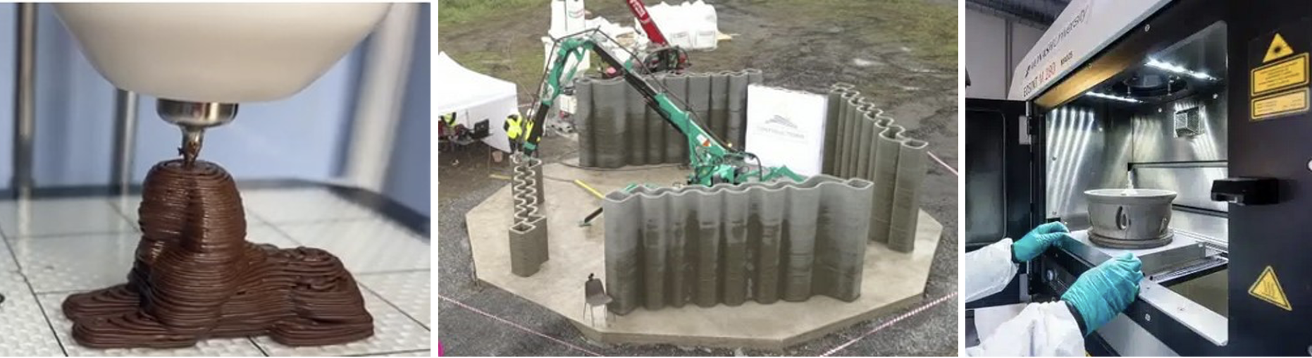 En dehors de l’industrie, le domaine de l’art est donc, pour l’auteur, celui où la fabrication additive pourrait bénéficier du plus grand essor, la sculpture en intégrant déjà, dans ses techniques traditionnelles, les principes fondamentaux. Le sculpteur serait donc souvent un Monsieur Jourdain de la fabrication additive ! Il l’était déjà au Néolithique avec la technique du colombin, qui en marque l’origine. Aujourd’hui, cependant, la fabrication additive possède une acception plus restreinte, sous l’influence de l’usage – pour ne pas dire la mode – et des outils techniques la permettant. Sans entrer dans le détail, il est nécessaire ici, bien que cela relève de la gageure, de donner le principe de base de la fabrication additive. Cette dernière repose sur la densification/agglomération in situ d’une toute petite quantité de matière, par fusion-solidification généralement, collage (avec ou sans liant) ou tout autre phénomène métallurgique (par exemple, par diffusion), grâce à un apport thermique et/ou l’aide d’un liant : le processus étant renouvelé de proche en proche jusqu’à intéresser le volume de matière nécessaire à la fabrication de l’objet. Le volume de matière aura été soit pré-positionné, soit déposé via une buse d’apport ou quelque autre système du genre. La caractéristique (le grand intérêt) de ce mode de fabrication tient en la maîtrise du parcours « de proche en proche » de la densification/agglomération, par pilotage numérique à l’aide d’un robot décrivant en 3D (tridimensionnellement) la géométrie (préalablement programmée) de la pièce à fabriquer, autrement dit l’œuvre à créer, pour employer un vocabulaire plus artistique. La source d’énergie thermique est, aujourd’hui, le plus souvent un laser qui peut déposer localement, à la pointe de son faisceau lumineux, l’énergie requise suivant la trajectoire imposée par le robot. Cependant, d’autres sources (fil chaud, torche…) peuvent être utilisées selon la nature des matériaux en jeu dans la fabrication, y compris le liant s’il en est. Le principe de la fabrication additive participe donc de l’art de la guerre : « Divide et impera » (« Diviser pour mieux régner »), prôné par Philippe de Macédoine, César, Louis XI, Machiavel et tant d’autres attirés par le pouvoir : l’art de la destruction vs l’art de la fabrication donc. L’art de la fabrication additive est de diviser l’énergie globale nécessaire à la transformation et à la mise en forme de la matière nécessaire à la fabrication de l’objet en quantité de petites énergies appliquées à autant de petits volumes mis en forme séparément et additionnés entre eux pour former l’ensemble. Procéder ainsi permet de préserver l’intégrité (tant mécanique que géométrique) de l’objet, en évitant tout excès de chaleur ou de contrainte susceptible de l’affecter lors de sa fabrication, contrairement à ce à quoi peuvent conduire la fonderie et/ou la découpe traditionnelles. C’est bien le développement des sources locales d’énergie (le laser, par exemple) et celui du numérique avec les procédés AO (« Assistés par Ordinateur ») qui ont stimulé la fabrication additive : à un point tel qu’il est maintenant difficile de se « soustraire à l’additif ». Ce dernier s’oppose au soustractif de la fabrication du même nom, soustractive donc, à laquelle la sculpture fait souvent penser. En soustractive, en effet, l’artiste taille, façonne la matière pour créer : enlever pour créer. La BD a décrit ce mode de fabrication de la meilleure des façons, grâce à Tintin et Lucky Luke ! Deux planches de Tintin au pays des Soviets (Casterman, 1930, pp. 112-114) montrent, en effet, Tintin fabriquant une hélice de rechange pour son avion, après un atterrissage en catastrophe. Le lecteur comprend bien le procédé soustractif quand il voit Tintin user de son canif, le seul outil qu’il ait eu sous (dans) la main, pour sculpter une hélice à partir d’un arbre trouvé là. Il a pu repartir sans encombre, avec pour seul inconvénient celui d’avoir dû s’y prendre à deux fois pour sculpter une hélice convenable. Il avait, en effet, inversé la géométrie de la première par rapport au sens de rotation souhaité, faisant aller l’avion à reculons au moment de la première tentative de décollage, de ce fait impossible. Dans Les Dalton dans le blizzard (Dupuis, 1963) un bûcheron canadien, devant Lucky Luke médusé, se fabrique à la hache un cure-dent qu’il débite à partir d’un érable ou d’un pin de la forêt environnante. Ces deux exemples soulignent déjà le temps long et la perte de matière (copeaux), pénalisants, en particulier en utilisation industrielle de la fabrication soustractive. La fabrication additive ne présente pas ces défauts car, à la différence de la soustractive, elle obéit à un principe général d’accumulation par micro-modelage avec fusion-solidification, et/ou agglomération et/ou assemblage de petits éléments de matière. Ces éléments sont des particules, éventuellement sous forme de gouttes (liquides donc), injectées dans une buse en tête de robot. Leur taille, pour fixer les idées, est, le plus souvent, comparable à celle de grains de farine, c’est-à-dire quelques dizaines de microns (millièmes de mm), réunies par millions (quelques millions par cm3) pour former l’objet à fabriquer. Pour certaines applications et en fonction de la nature du matériau, leur taille peut être plus grossière, millimétrique par exemple. Vu la multiplicité des technologies disponibles (couvertes chacune par un acronyme particulier qu’il est inutile de mentionner ici) et des matériaux, les applications de la fabrication additive sont quasi infinies (figure 2), s’étendant du chocolat (figure 2a) à la maison individuelle (figure 2b), en passant par de nombreu