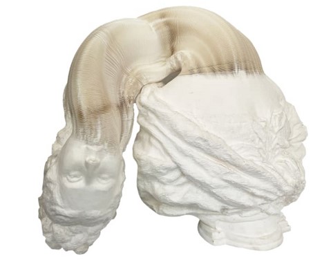 Au-delà de l’impression 3D permettant facilement la fabrication additive en résine (figure 6, par exemple), l’enjeu actuel est l’ouverture vers la gamme la plus large, pour ne pas dire infinie, des matériaux se prêtant à la fabrication additive et la reproduction des formes et effets créés virtuellement. La fabrication additive se posera bien alors, tel que son potentiel l’affiche actuellement, comme le bras, si ce n’est armé mais au moins outillé, du numérique : le bras en question n’étant autre que celui du robot qui équipe la plupart des procédés qui la composent. La pénétration dans l’art de la fabrication rapide/impression 3D a été précédée de celle dans le domaine de la décoration et du design, plus prompts à explorer la capacité à produire facilement (et pas cher) de nouvelles formes, à l’exemple du prototypage rapide industriel. A l’inverse, la copie rapide de formes existantes constitue un autre atout de la fabrication additive. Il est donc normal que la haute couture et la haute culture figurent parmi les premiers intéressés. Dans le milieu de la mode, Iris Van Harpen fut pionnière, avec la création de robes, présentées au Musée de la dentelle de Calais dès 2013. Il s’agit bien de dentelle, en effet, mais de plastique, obtenue par polymérisation sous faisceau laser. De telles formes complexes sont aujourd’hui réalisables en métal : en n’importe quel matériau d’ailleurs sauf en tissu, ce qui est un comble, soit dit en passant. La copie par fabrication additive, souvent préférée au moulage/modelage de résines ou de stuc par exemple, intéresse la sauvegarde et/ou la présentation muséale d’œuvres de tous genres, pour les rendre plus accessibles au public, y compris pour les toucher.