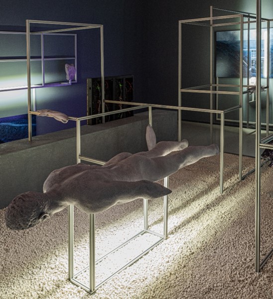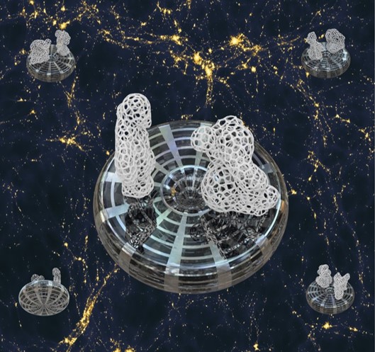 Dans le domaine de l’art proprement dit, les premières œuvres remarquables issues de la fabrication additive se situaient dans la veine de la stratoconception pure et traditionnelle. Excluant les designers et décorateurs, fussent-ils de grand talent, peu de véritables artistes revendiquèrent cette technique. Mimmo Paladino et Li Hongbo en furent. L’un joua, dans son Ex-Voto (2013), d’effets de lumière magnifiquement surprenants provoqués par la superposition de plaques de verres colorés (figure 3). L’autre, même si son œuvre reste d’essence assez classique, ne serait-ce que parce qu’il utilise la technique traditionnelle chinoise des lanternes, dite « en nids d’abeille », combinée à la sculpture de feuilles de papier empilées qui en est la base (figure 4). Après la stratoconception classique comme il vient d’être vu, les artistes contemporains ne se sont, pour l’instant, aventurés en fabrication additive qu’avec ce qui est communément appelé aujourd’hui l’impression 3D. Même si, stricto sensu, l’impression 3D recouvre tout procédé de fabrication additive et en est quasiment synonyme, l’appellation impression 3D se confond plutôt aujourd’hui avec la première technique du genre, à savoir celle utilisant de la résine polymère (ou tout autre matériau à très bas point de fusion) et développée initialement pour le prototypage rapide. L’usage faisant foi, notamment parce que cette technique est maintenant largement répandue, y compris dans le grand public, l’acception d’impression 3D s’en trouva restreinte. Les artistes ont donc commencé de l’employer, notamment du fait de sa praticité et de son coût abordable, en remplacement des techniques de moulages et/ou collages. Sa souplesse d’utilisation rend l’exploration des formes aisée, de pair avec un jugement artistique directement sur pièce, rejoignant en cela les objectifs du prototypage rapide industriel. Dans sa saisissante installation La Quatrième Mémoire (2025) (figure 5), présentée récemment au Jeu de Paume, Grégory Chatonsky l’exploite à merveille pour atteindre « le réalisme contrefactuel qui n’a jamais existé » (pour reprendre les termes de la note accompagnant l’exposition) qu’il revendique dans son œuvre. La formule précédente sur le réalisme contrefactuel s’applique, d’ailleurs, parfaitement à l’impression 3D, imposant ainsi Grégory Chatonsky, selon l’auteur de cet article, comme un promoteur de cette technique. Pour sa part, Christian Lavigne, pionnier de la cybersculpture et inventeur du terme (qu’il proposa en 1995, via son association Ars Mathematica), attend beaucoup de la fabrication additive pour la traduction des œuvres numériques en réalisations concrètes, c’est-à-dire palpables au sens propre du terme. Pour en savoir plus qu’il n’en trouvera ici, le lecteur se reportera avec bonheur et privilège (puisque ce sera le premier du genre) à la somme sur le sujet, en préparation (2026) par Lavigne sous le titre Histoire de la cybersculpture/ Mythologie et histoire de la sculpture et de ses machines.