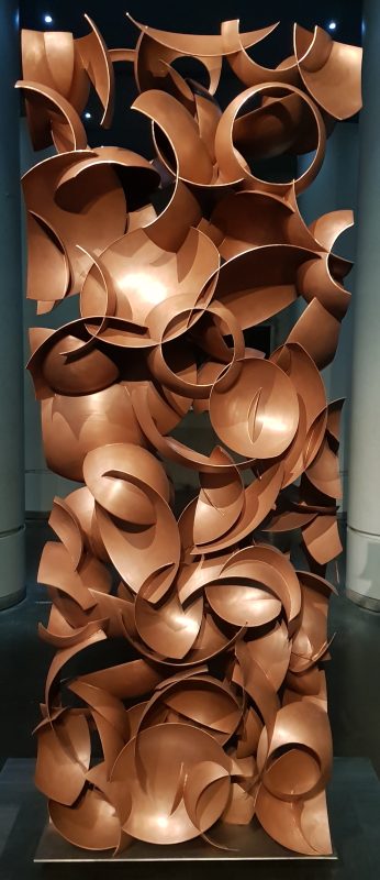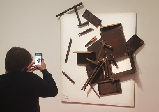 Dit sans nuance péjorative, les premiers artistes inspirés et poussés jusqu’au grand public par la fabrication additive appartiennent à la catégorie des artistes de décoration et de design, qualifiables pour certains de vosgiens (au sens Place des Vosges du terme), créant, par exemple, des sculptures « découpées-accumulées », ne manquant pas de faire penser à Arman. Arman peut alors, en effet, passer pour l’inspirateur de la fabrication additive. L’accumulation en est la marque de fabrique – c’est le cas de le dire – : fascinante pour beaucoup, ne serait-ce qu’à en juger par son effet sur l’attitude de certains visiteurs de l’exposition Tous Léger au Musée du Luxembourg, en 2024, (figure 7). La subjugation du regardeur, soumis au même effet, reste aussi vive, soixante ans après les créations d’Arman, devant celles de Tarek Elkassouf, par exemple, qui, par la forme de ses composants, évoque directement la fabrication additive telle que définie plus haut (figure 8). Déjà en bidimensionnel, l’accumulation provoque, par elle-même, une impression de tridimensionnel (sans rien à voir avec l’impression 3D), qui pourrait être qualifiée de pseudo-3D. Les dessins de Maurits Escher, sans aller jusqu’à l’Op-art de Vasarely et consorts, en sont les témoins. Les peintures d’Erró, en 2D donc, ont aussi popularisé l’accumulation, notamment celle d’avions et de voitures en un impressionnant réquisitoire contre la consommation et son inhérent gâchis. L’effet 3D ressenti s’apparente à celui amorcé par Arman dans ses bas-reliefs (ou « sculptures modestes » selon le vocable trouvé par la sagace artiste contemporaine Carlotta Bailly-Borg) de chaussures accumulées.