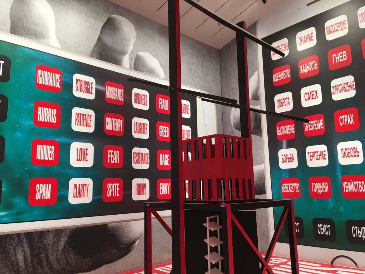 C’est le cas, par exemple, du kiosque « multimédia » imaginé par Gustav Klucis (1895-1944) en 1922 et disposé au centre d’une installation signée Barbara Kruger. Comme à son habitude, l’artiste américaine déploie d’immenses reproductions photographiques et textuelles enserrant le visiteur. Quatre mains brandissent chacune un écran de Smartphone occupant la surface d’un mur ; les icônes d’applications y sont remplacées par des pastilles rouges, noires et blanches sur lesquelles s’affichent, en anglais, en russe et en italien, différents sentiments et états, tels « peur », « arrogance », « ignorance », « gentillesse », « amour », « patience », « résistance » ou encore « rage ». Au sol, cette citation de l’écrivain autrichien Karl Kraus (1874-1936) : « The secret of the demagogue is to make himself as stupid as his audience so that they believe they are as clever as he » (« Le secret du démagogue est d’avoir l’air aussi stupide que son public afin que celui-ci se croie aussi intelligent que lui »). « Si l’œuvre à la résonance historique de Klucis évoque les modes de production et de diffusion d’images et d’informations du début du siècle dernier, mon installation entend évoquer l’expansion, la simultanéité et la réciprocité des systèmes de “distribution” que nous produisons et qui nous reproduisent, précise Barbara Kruger dans l’édition spéciale du magazine britannique ArtReview mise à disposition des visiteurs. L’écran devient le miroir de nos choix, la forme, réduite à l’extrême, du haïku devient notre langage commun et le fait de partager devient à la fois un acte de confession et d’appropriation. Nous faisons fonctionner des applis et celles-ci dictent nos agissements. » Non loin, sont projetés en boucle deux extraits d’un projet participatif conduit trois années durant, entre 2008 et 2011, sur la plateforme de réalité virtuelle Second Life par la Chinoise Cao Fei : RMB City dévoile une cité utopique, dans laquelle Marx, Mao et Lénine, entre autres, vivent et débattent ensemble. Par leur entremise et celle d’autres avatars, Cao Fei pointe notamment, avec un humour largement teinté d’ironie, les contradictions induites par la soif d’urbanisation de son pays natal.
