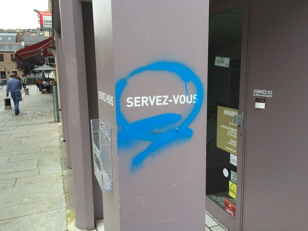 Image d’ouverture> « Servez-vous », Rennes, 2016, après une manifestation contre la loi travail. Photo Martin Le Chevallier. Creative Commons BY-NC-SA. Extrait du Répertoire des subversions : « DÉTOURNER UN MESSAGE. En 2016, dans une rue de Rennes, un support de prospectus est surmonté de l’inscription « Servez-vous ». Après le passage d’une manifestation, le support et les prospectus ont disparu. Et l’inscription a été entourée d’un trait bleu tracé à la bombe. « Servez-vous » devient ainsi une injonction anarchiste et existentielle. »