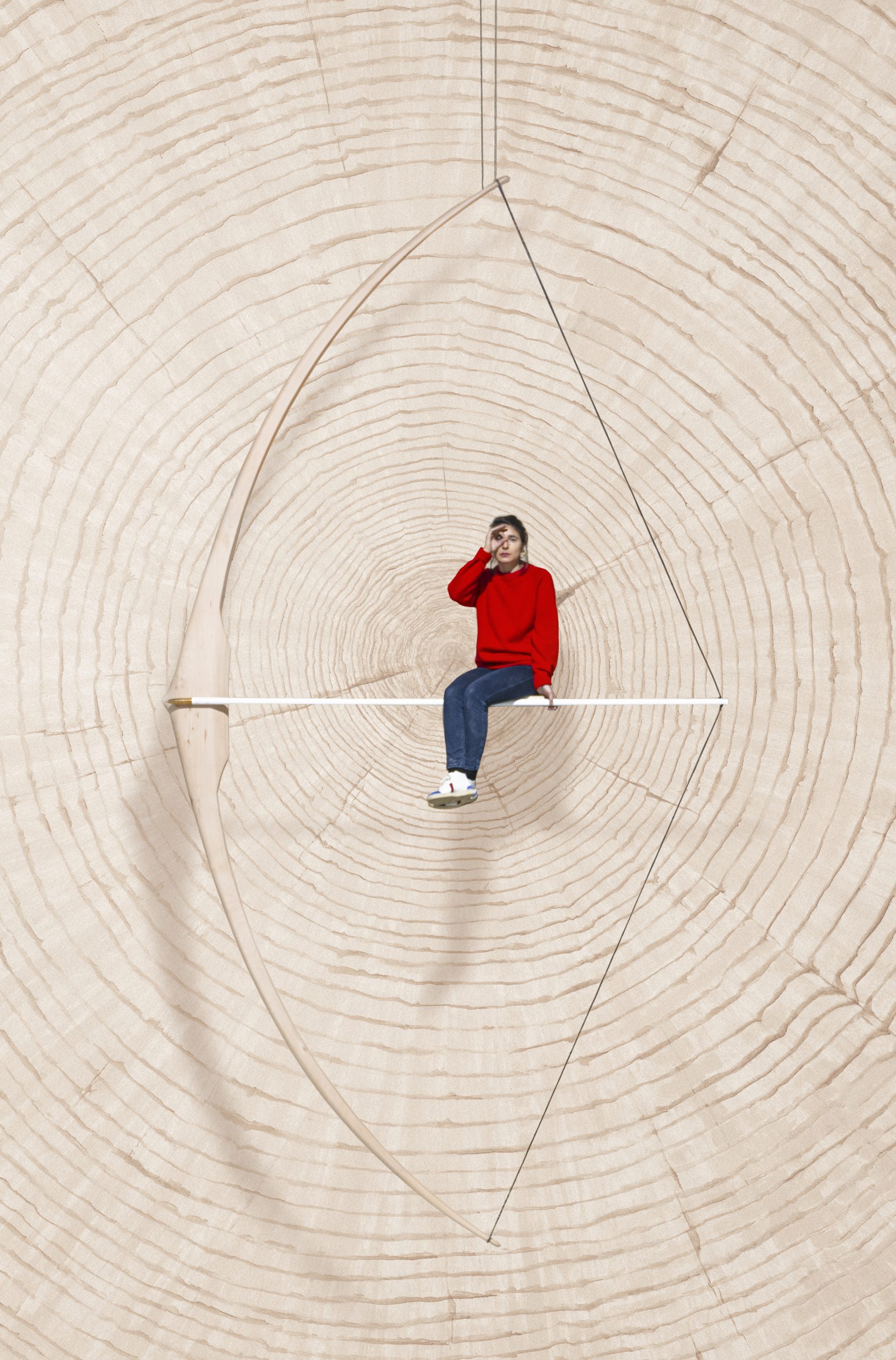 La proposition débute avant même de pousser les portes du 24 Sèvres. Dans les vitrines, pas moins de 1800 flèches en bois forment des motifs géométriques inspirés du minimalisme américain – Prune Nourry vit et travaille à New York depuis dix ans – à la Frank Stella. Celles-ci partent de la première vitrine, dans laquelle est présenté un arc, et se dirigent toutes vers leur cible. Un sein disposé en fin de parcours. Afin d’aborder au mieux l’exposition, il vous faudra emprunter « L’entrée sur l’art contemporain », située à l’angle des rues du Bac et de Babylone, où une vidéo expliquant la genèse et la réalisation du projet ainsi que des extraits de Serendipity sont diffusés. Au cœur de l’établissement, sous les verrières, un arc de cinq mètres de haut, sculpté entièrement en bois de hêtre accompagne une flèche de près de trois mètres et une corde d’arc. En face, une cible en forme de sein de quatre mètres de diamètre est visée par 888 flèches habillées de plumes blanches. Le choix de l’arc, instrument de guerre, est équivoque. Dans la mythologie, les Amazones coupaient leur sein droit afin d’être de meilleures archères. Lors de son traitement, l’artiste a subi une ablation du sien. Dans une interview publiée par Numéro, le magazine du Bon Marché, Prune Nourry se souvient : « Au moment de ma chimiothérapie, j’ai dû couper ma natte qui pour moi était un symbole, et mon amie Agnès Varda m’a dit : “Moi, j’ai coupé ma natte à 18 ans pour passer de jeune fille à femme, et c’est un rituel que j’aimerais faire avec toi.”Lorsqu’on coupait ma natte, j’ai mis un drap blanc : devant ce tissu, le sein à l’air et la natte coupée, Agnès m’a dit que je ressemblais à une Amazone. » La sculpture est polysémique, autorisant donc plusieurs lectures. Si certains voient dans les flèches les rayons d’une chimiothérapie au pouvoir guérissant, d’autres y voient la maladie qui attaque, ou encore se racontent une version plus personnelle en imaginant des spermatozoïdes cherchant à féconder un ovule. Si l’artiste transforme ses maux en matière, l’utilisation du bois ne doit rien au hasard. La sculptrice utilise un matériau organique, vivant, qui lorsqu’on le coupe révèle des lignes concentriques aussi lisibles que des cicatrices. Le processus créatif participerait alors à une cicatrisation pour la plasticienne.