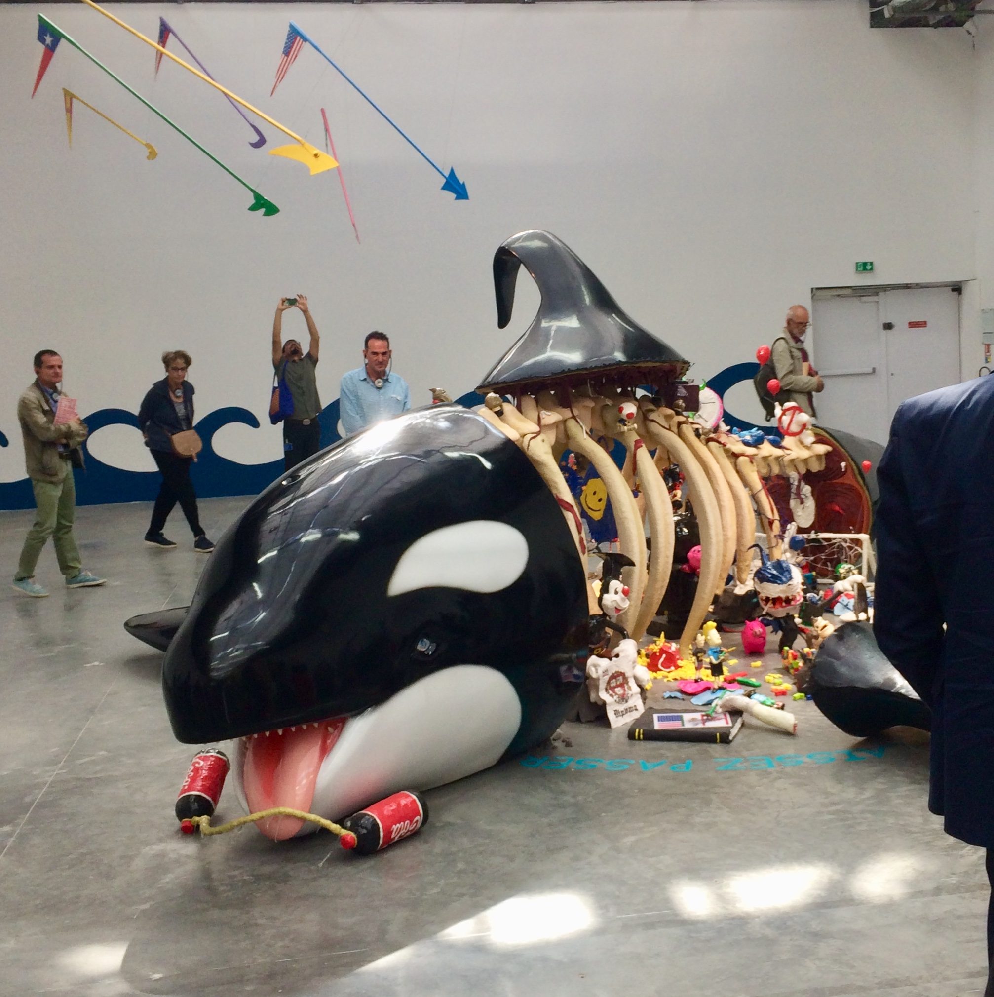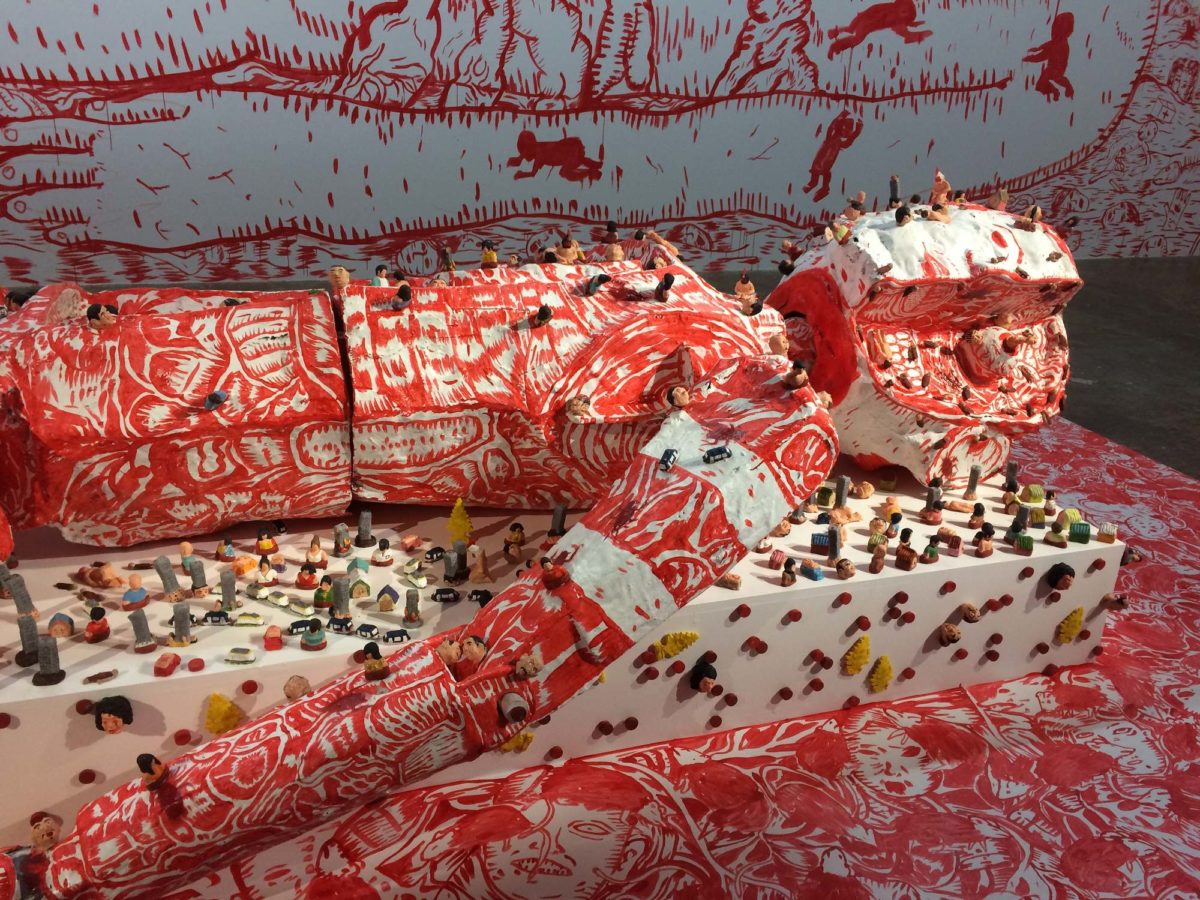 Les critiques politiques, elles aussi, abondent. Tantôt acerbes, violentes ou empreintes d’ironie, elles dénoncent la corruption et les niveaux de vie si disparates de ces villes émergentes. Censurée au Nigeria et cumulant plusieurs millions de vues sur Youtube, une vidéo de Falz, This is Nigeria, fait écho à la chanson rap de Childish Gambino, This is America, qui s’attaque aux violences policières aux Etats-Unis. Pour sa part, l’artiste nigérian s’en prend à la corruption, l’omniprésence de l’église évangélique, la pauvreté, le terrorisme de Boko Haram, autant de maux qui rongent son pays natal. Echoué au milieu d’une salle, se tient l’immense orque en résine du collectif Biquini Wax EPS (Sa la na, a yuum, iasis, laissez faire, laissez passer, 2019), référence au héros du film Sauvez Willy (1993) – l’animal est l’un des symboles les plus populaires de la ville de Mexico. Sa carcasse, à moitié visible, est envahie d’objets évoquant la pop culture et la société de consommation américaine. Les artistes invitent à repenser l’histoire du Mexique et s’inquiètent de la disparition des traditions culturelles, étouffées par des références mondialisées, majoritairement d’origine américaine.